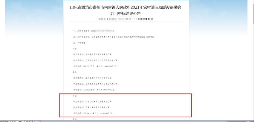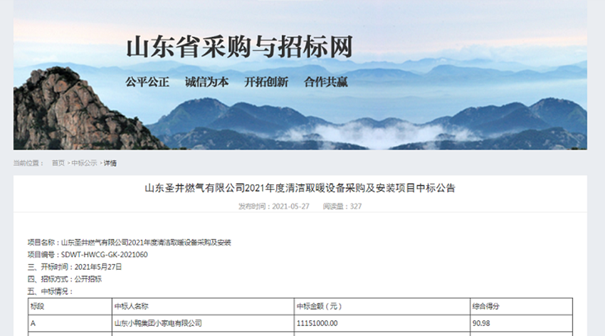 8月26日,泰安市公共資源交易網公示新泰2021年冬季清潔取暖改造項目設備采購第九標段招標結果,山東小鴨集團小家電有限公司作為首位候選品牌,成功中標。